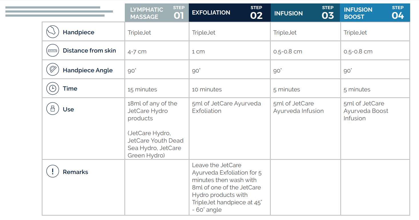 Like all JetPeel treatment sessions, the JetPeel’s Ayruveda treatment starts with a Lymphatic Massage using one of the JetCare Hydro liquid solutions – JetCare Hydro, JetCare Youth Dead Sea Hydro or JetCare Green Hydro.